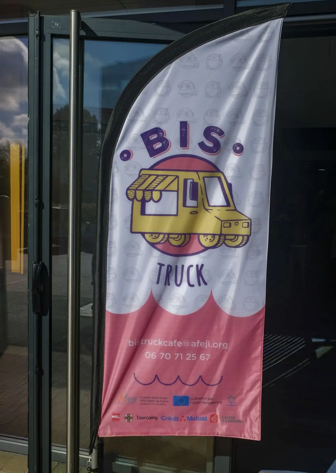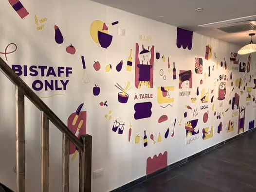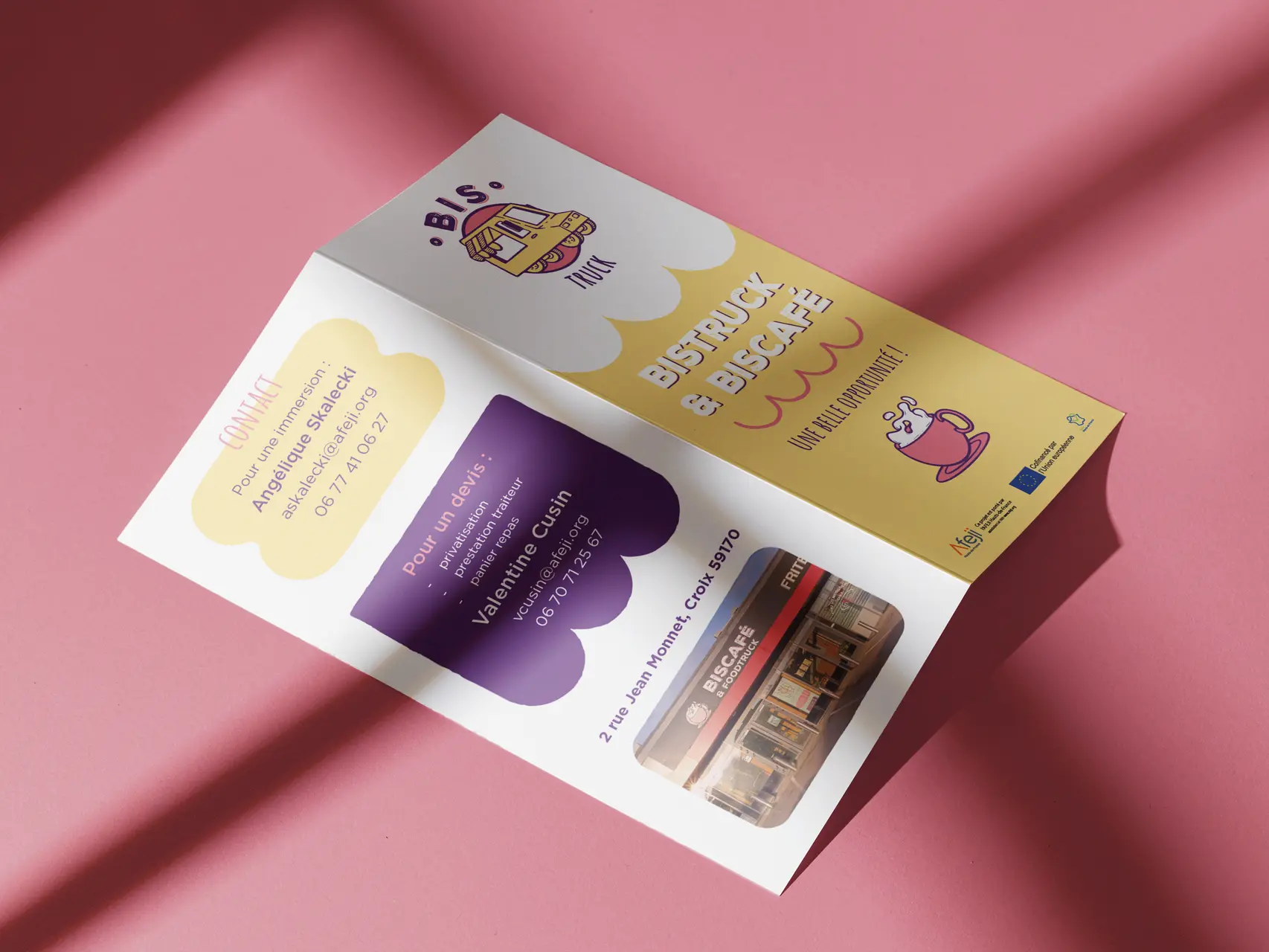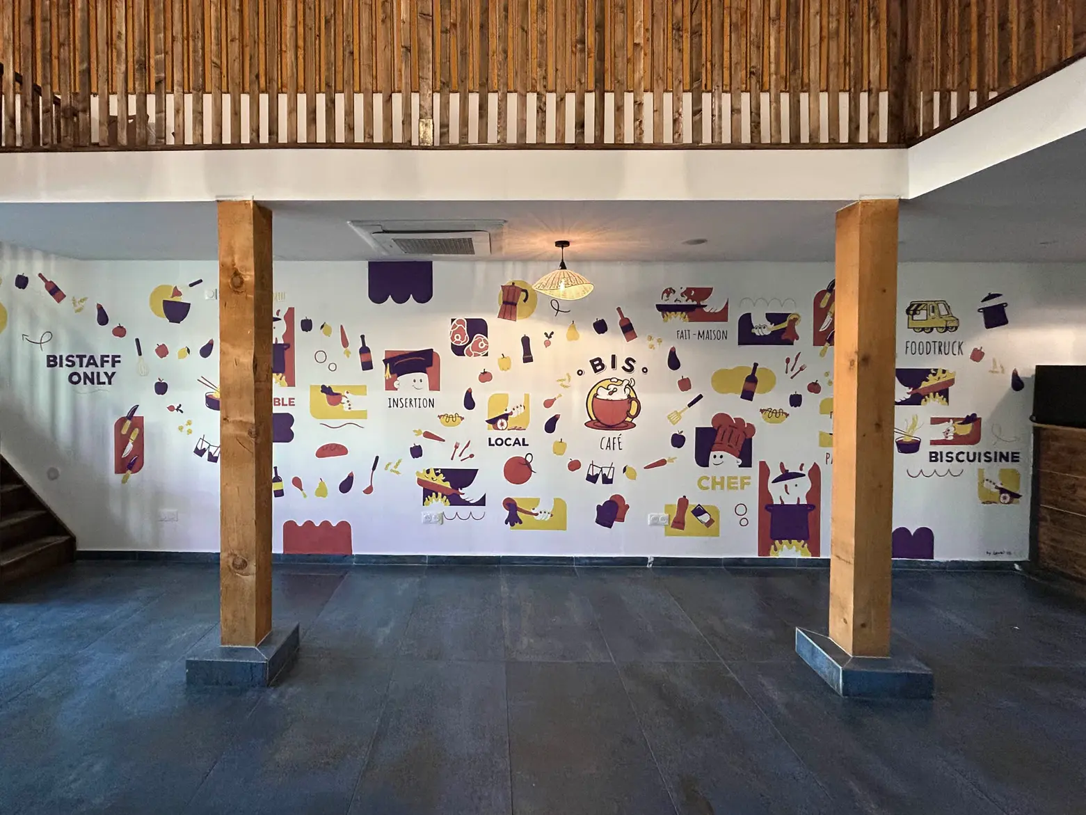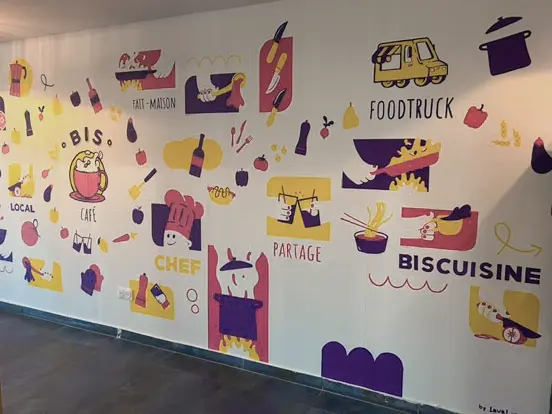 Avec Cyprien @cypcyp_art nous avons travaillé toute la conception de l'image de marque du Bistruck : la création du logo et de la charte graphique, les supports visuels et leur flyer, le flocage du camion et de leur enseigne. On a également réaliser une fresque murale dans leur local Biscafé à Croix.