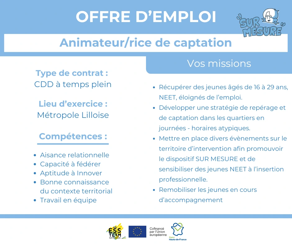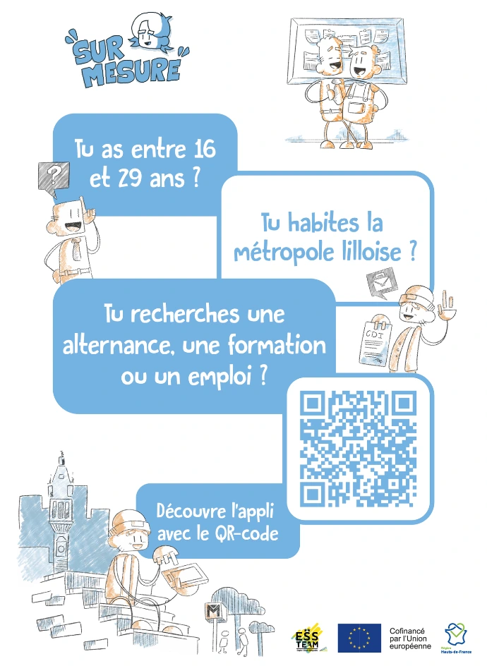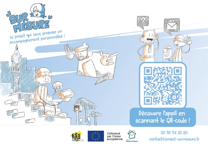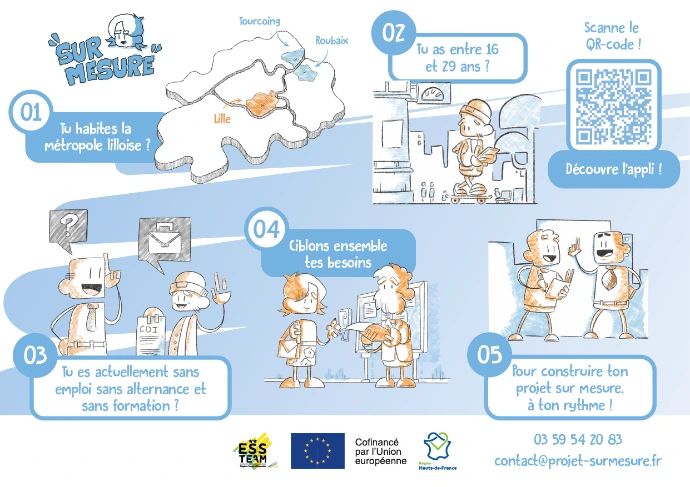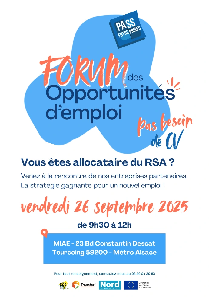 Dispositif de la MIAE Tourcoing, chargé de ré-intégrer les personnes éloignées du monde du travail. Création de plusieurs visuels de communication à partir d'une charte graphique existante, pour les réseaux et sur différents supports physique ( Flyer, Affiche, Roll-up, carte de visite, etc.)