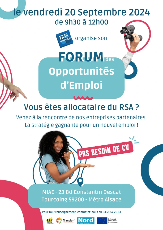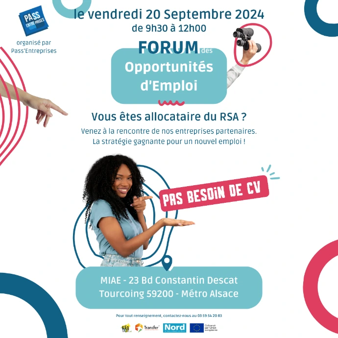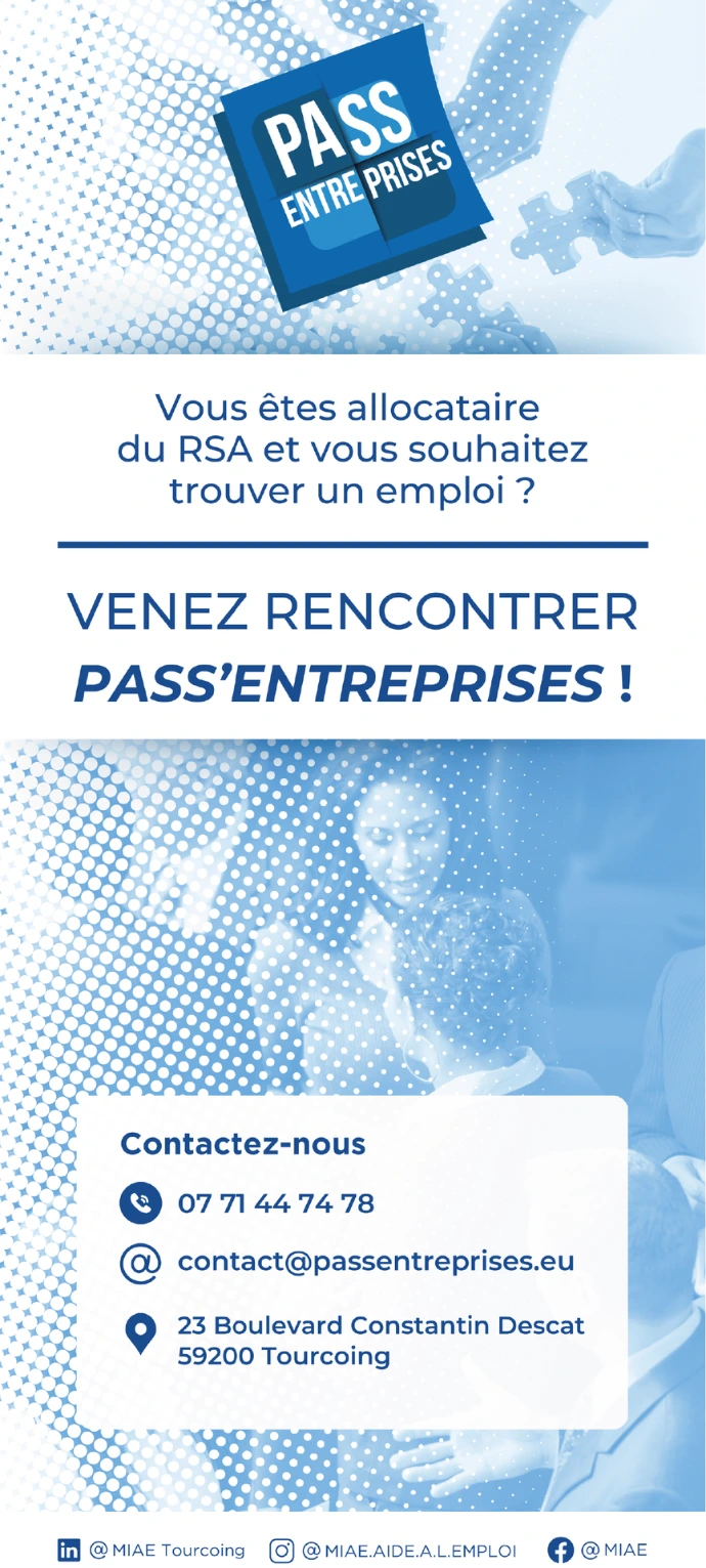 Dispositif de la MIAE Tourcoing, chargé de mettre en relation leurs entreprises partenaires et des personnes en recherche d'emploi. Création de plusieurs visuels de communication, pour les réseaux et sur différents supports physique ( Flyer, Affiche, Roll-up, carte de visite, etc.)